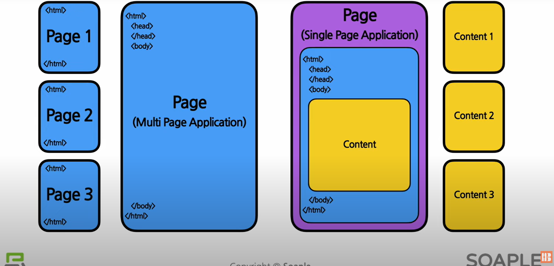 multi page application: 여러 html존재, 사용자요청에 따라 새로운 페이지 로딩